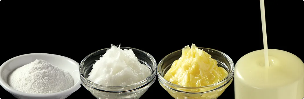 | 反応モノグリセライド | グリセリンを親水基に持つ、一般的な乳化剤です。 原料の油脂・脂肪酸の種類の違いで異なる効果を発揮します。 |