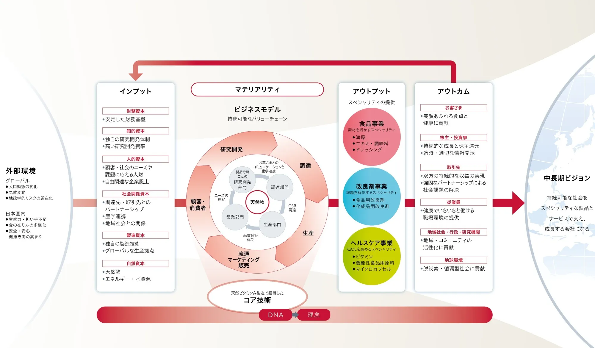 理研ビタミングループは、コア技術を活かしたスペシャリティな製品とサービスを通じて価値を創出し、持続的な成長を目指します。