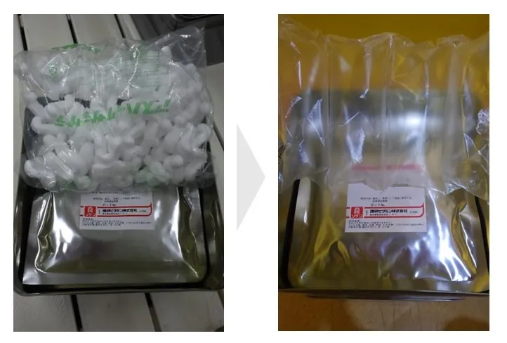京都工場では、サンプル発送用の緩衝材をバラ緩衝材からエアークッションに変更し、プラスチック使用量の削減につながりました。