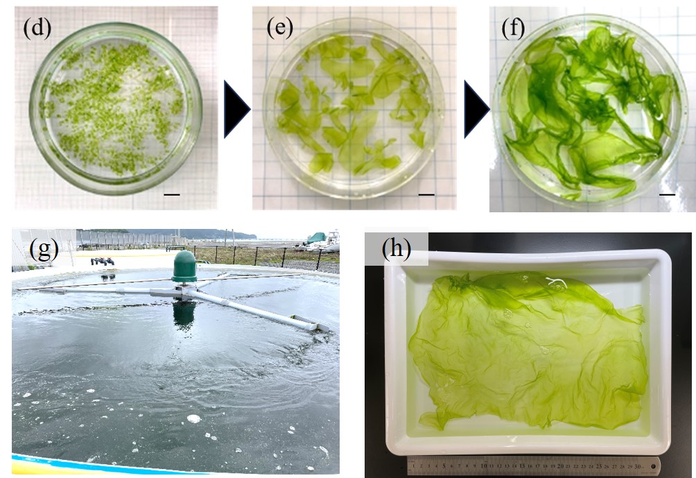 これらの知見をもとに、理研食品と高知大学は、ヒトエグサを単細胞のままで増殖させるバクテリア(細菌A)と、単細胞から葉状化を促進させるバクテリア(細菌B)を選定しました。これによって、単細胞状態で大量に増殖させたヒトエグサを葉状化させて、陸上養殖用の種苗としての活用が可能となりました(Kinoshita et al. 2022, Cytologiaに関連する研究成果を発表)。