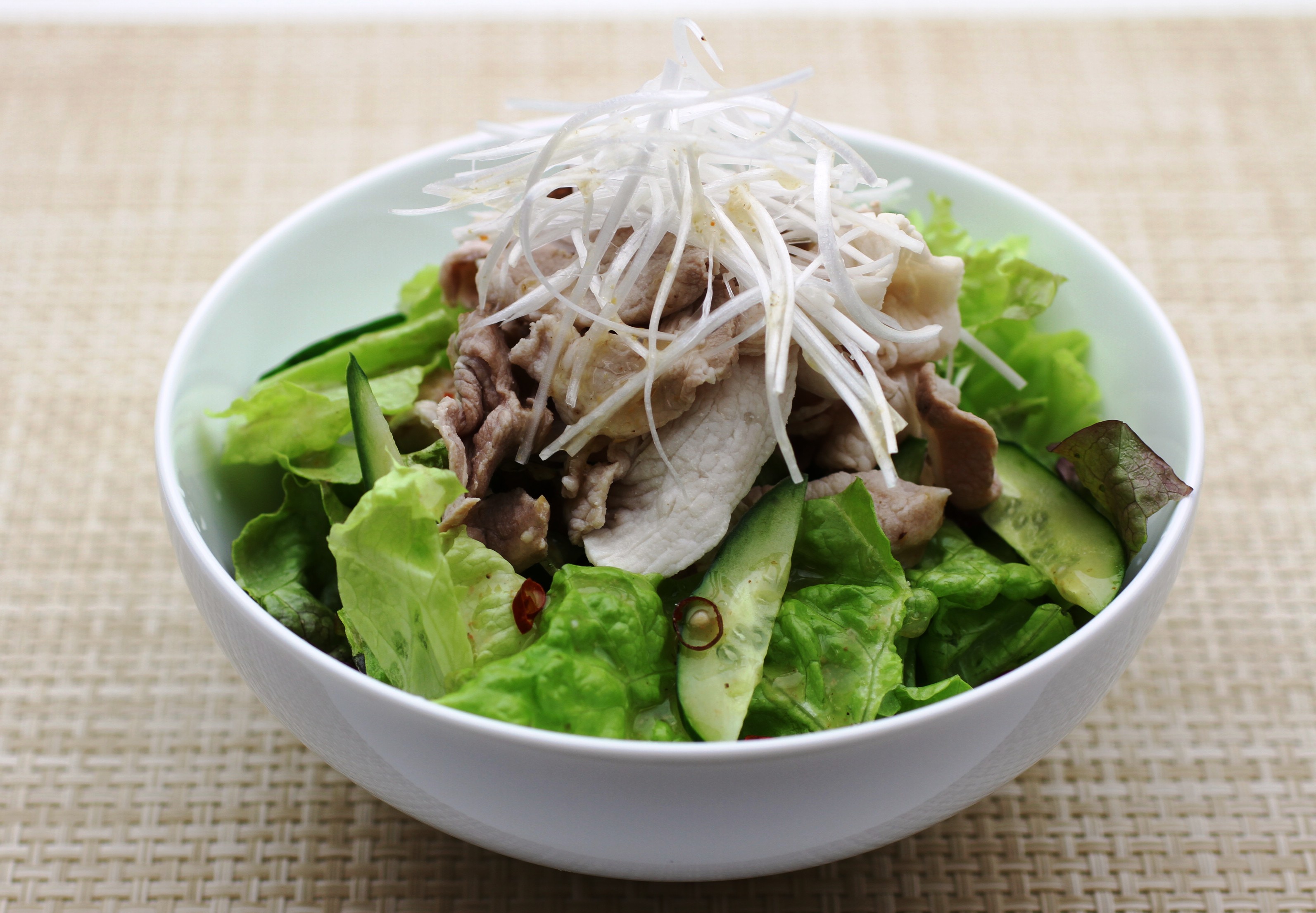 - 豚肉は、60~70℃の湯で火を通し、水にとってしめ、水気をペーパーで拭いておく。