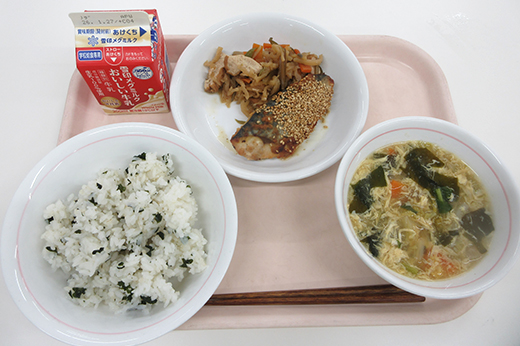海から採れたままのわかめ原藻の手触りや、においを感じられるとても貴重な機会でした。児童は、わかめの大きさや手触りに驚き、色の変化に驚き、漁師さんが働いている時間に驚き・・・「知らなかった!」「びっくりした!」という感想がたくさんありました。当日提供したわかめ給食では、茎わかめ、めかぶ、葉を探し食感の違いを味わっていました。『見て、触って、学んで、食べる』授業は、児童の心に残る体験になったと思います。
