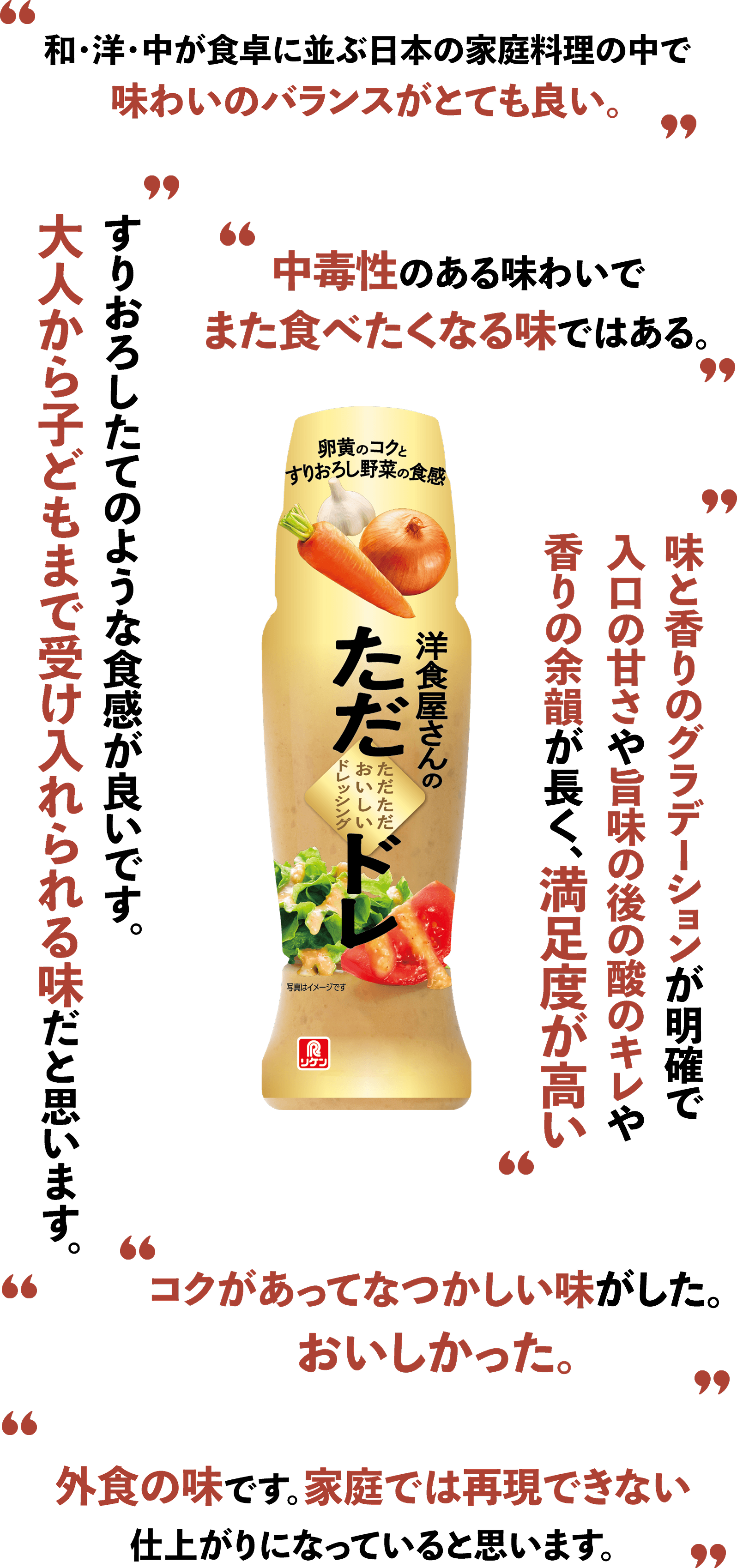 玉ねぎ、にんじんをはじめとした野菜の自然な甘み、卵黄やすりごまのコクが、どんな野菜も「ただただおいしく」変身させます。野菜嫌いのお子様も、気がつけば「おかわり!」。家族の健康を、おいしく楽しくサポートします。